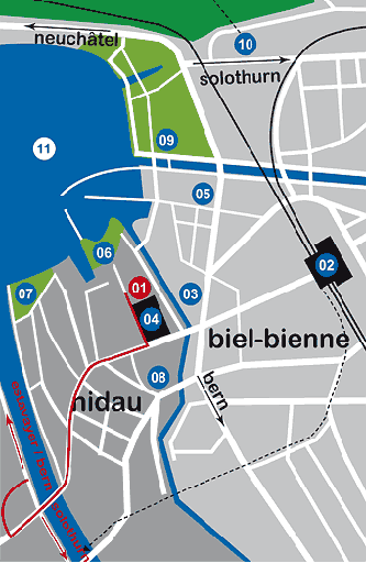 | Lago Lodge 01 Bahnhof Biel 02 Hotel Continental 03 BKW / FMB 04 Shell Tankstelle 05 Strandbad Biel 06 Strandbad Nidau 07 Schloss Nidau 08 Deutsches Gymnasium 09 Magglingenbahn 10 Bielersee 11 |