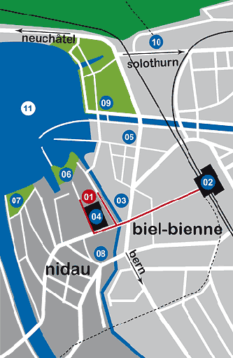 | Lago Lodge 01 Bahnhof Biel 02 Hotel Continental 03 BKW / FMB 04 Shell Tankstelle 05 Strandbad Biel 06 Strandbad Nidau 07 Schloss Nidau 08 Deutsches Gymnasium 09 Magglingenbahn 10 Bielersee 11 |